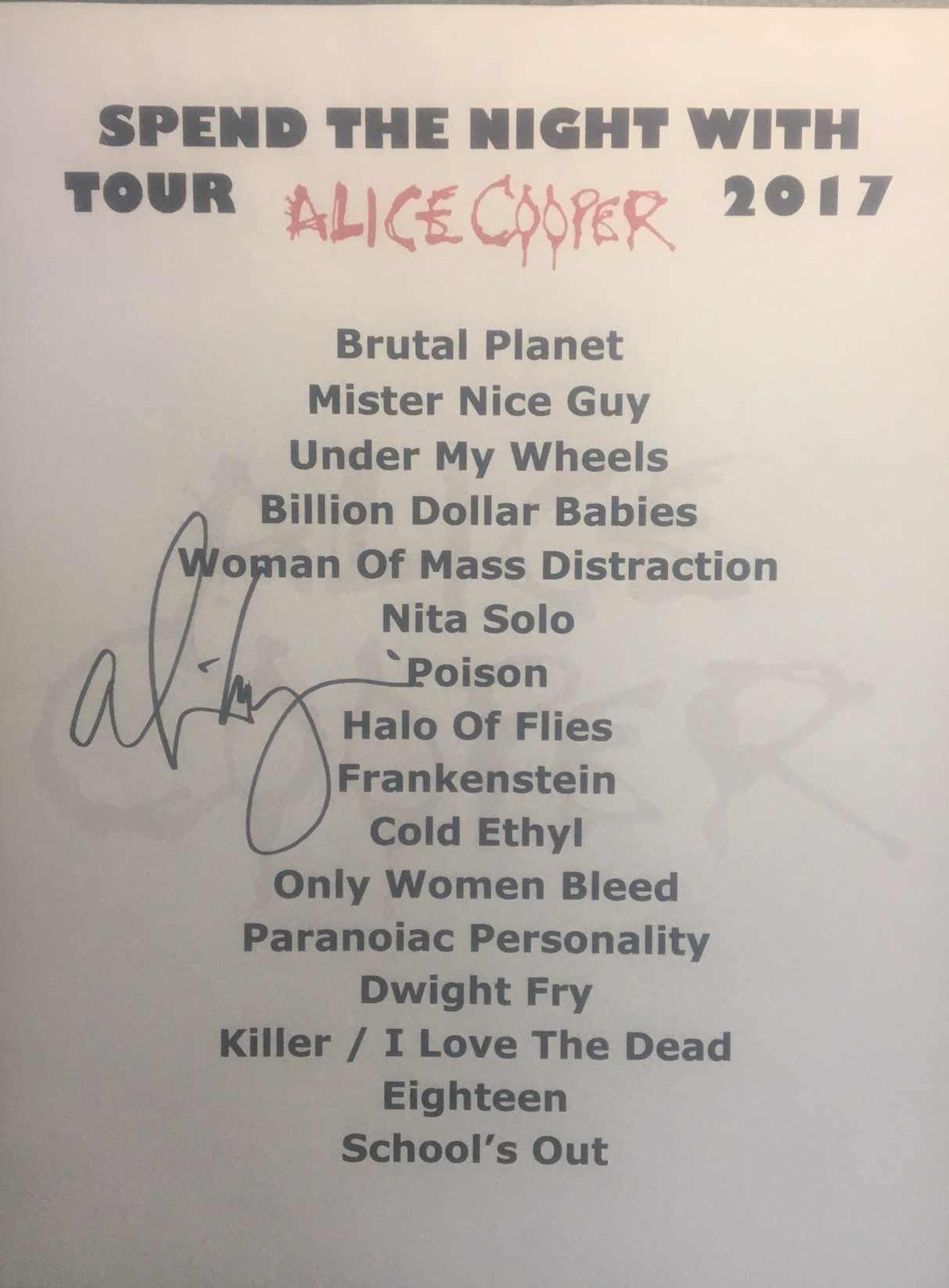 Alice Cooper - Signed VIP Set Sheet 2017 USA